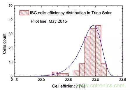同年,由常州天合光能光伏科學與技術國家重點實驗室獨立研發的6英寸大麵積IBC電池效率已達22.9%,成為了6英寸IBC電池的最高轉換效率。同時,天合光能依托國家863項目建成中試生產線,進入2015年後,天合光能科研人員采用最新開發的工藝,在中試生產線做出了平均22.8%,最高23.15%(內部測試)的結果,大部分電池效率在22%以上,如圖1所示,達到了目前工業級6英寸晶體矽電池效率的最高水平(SunPower電池均為5英寸)。