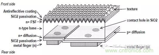 IBC電池的常見結構如圖2所示。在高壽命的N型矽片襯底的背麵形成相間的P+和N+擴散區,前表麵製備金字塔狀絨麵來增強光的吸收,同時在前表麵形成前表麵場(FSF)。前表麵多采用SiNx的疊層鈍化減反膜,背麵采用SiO2、AlOx、SiNx等鈍化層或疊層。最後在背麵選擇性地形成P和N的金屬接觸。