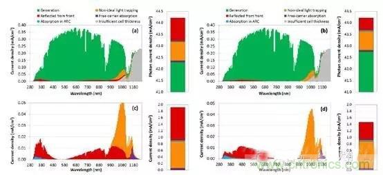 圖3 IBC電池單層膜(a,c)及多層膜(b,d)的光學損失分布圖