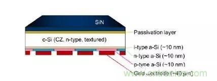 采用IBC與HJ技術結合的HIBC技術可以使電池效率進一步提升,其結構如圖4所示,在矽片表麵同時采用本征的非晶矽進行表麵鈍化,在背麵分別采用N型和P型的非晶矽薄膜形成異質結。其優點是利用非晶矽優越的表麵鈍化性能,並結合IBC結構沒有金屬遮擋的結構優點,采用相同的器件結構,日本鬆下和夏普公司目前取得了25.6%和25.1%的電池效率,這將成為未來IBC電池的重要方向。