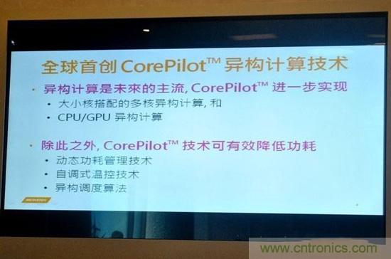 聯發科CTO周漁君曾表示:“現在影響手機的體驗並非手機處理器的性能,而是電池的使用時間,我們的CorePilot技術可以分配不同任務讓不同的核心處理,這就讓功耗與性能得到了完美的統一”