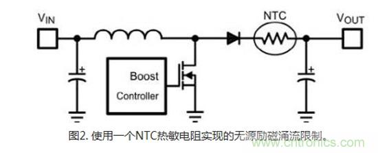 最簡單的限流機製是采用一個負溫度係數 (NTC) 熱敏電阻(圖2)。由於在冷卻時出現高阻抗,NTC在zai開kai始shi啟qi動dong時shi限xian製zhi勵li磁ci湧yong流liu。其qi自zi身shen功gong率lv耗hao散san所suo導dao致zhi的de自zi發fa熱re可ke使shi阻zu抗kang下xia降jiang,從cong而er能neng夠gou使shi更geng多duo的de電dian流liu流liu過guo。這zhe個ge方fang法fa的de優you勢shi在zai於yu簡jian便bian易yi行xing且qie成cheng本ben低di廉lian。然ran而er,在zai惡e劣lie條tiao件jian下xia使shi用yong這zhe個ge方fang法fa會hui帶dai來lai某mou些xie缺que點dian。比bi如ru,在zai汽qi車che發fa動dong機ji艙cang等deng溫wen度du大da幅fu變bian化hua的de環huan境jing內nei,會hui出chu現xian使shiNTC初始阻抗降低的高環境溫度;此外,如果不仔細管理整個環境運行條件,就會導致過多的勵磁湧流。如果出現重新啟動的情況,NTC器件溫度也許會在下一次加電之前尚未冷卻。在輸出電容完全放電時,由於散熱速度較慢,NTC對於勵磁湧流的限製會變到最低。此外,如果負載出現短路故障,NTC將無法限製比所選標稱運行條件高的電源電流。最後,NTC方法對於單一功能保護有效,但是由於使用的是無源組件,這個方法也會受到某些限製。