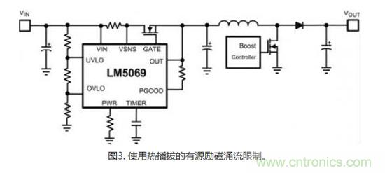 選擇像MOSFET這(zhe)樣(yang)的(de)主(zhu)動(dong)限(xian)製(zhi)裝(zhuang)置(zhi)需(xu)要(yao)一(yi)個(ge)勵(li)磁(ci)湧(yong)流(liu)限(xian)製(zhi)控(kong)製(zhi)器(qi)的(de)控(kong)製(zhi)電(dian)路(lu),它(ta)也(ye)被(bei)稱(cheng)為(wei)熱(re)插(cha)拔(ba)控(kong)製(zhi)器(qi)或(huo)電(dian)子(zi)熔(rong)絲(si)。這(zhe)是(shi)一(yi)個(ge)位(wei)於(yu)升(sheng)壓(ya)控(kong)製(zhi)器(qi)之(zhi)前(qian)的(de)附(fu)加(jia)集(ji)成(cheng)電(dian)路(lu) (IC),很多此類的控製器(圖3)特有包含電流和電壓環路的可編程湧入限製,旨在確保MOSFET保持在安全工組區 (SOA) 內的同時,控製湧入率。SOA用於監視維持關鍵保護器件的長期可靠性。此外,湧入控製器會具有兩個電流閥值:一個用於規範湧入限製,第二個是在嚴重過流情況下用於完成斷路器功能。這種方式的一個明顯優勢就是你能夠實現它的先進保護特性;然而,通常來說,這個解決方案的成本和複雜度要高於無源方法。