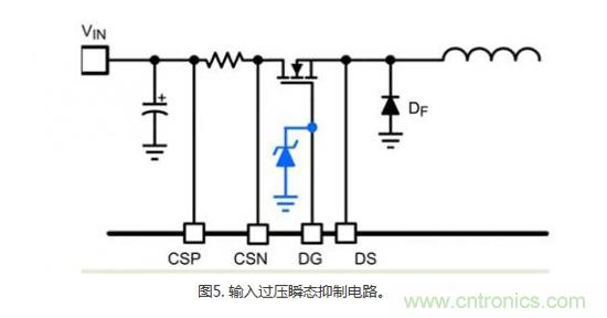 需牢記的一點是,雖然將MOSFET用於保護功能可實現對湧入或故障情況的快速響應,但是你應該在MOSFET的(de)輸(shu)出(chu)端(duan)上(shang)執(zhi)行(xing)一(yi)個(ge)適(shi)當(dang)的(de)電(dian)壓(ya)緩(huan)衝(chong),以(yi)確(que)保(bao)用(yong)於(yu)保(bao)護(hu)功(gong)能(neng)的(de)器(qi)件(jian)不(bu)會(hui)使(shi)下(xia)遊(you)電(dian)路(lu)出(chu)現(xian)問(wen)題(ti)。在(zai)升(sheng)壓(ya)電(dian)路(lu)中(zhong),保(bao)護(hu)器(qi)件(jian)之(zhi)後(hou)出(chu)現(xian)的(de)第(di)一(yi)個(ge)直(zhi)插(cha)式(shi)組(zu)件(jian)是(shi)原(yuan)邊(bian)電(dian)感(gan)器(qi)。續(xu)流(liu)二(er)極(ji)管(guan)可(ke)以(yi)管(guan)理(li)保(bao)護(hu)MOSFET與電感器之間的任何電壓振鈴,它隻有在保護開關迅速關閉時才會導電,特別是在斷路器位於電感器左側時(圖5)。