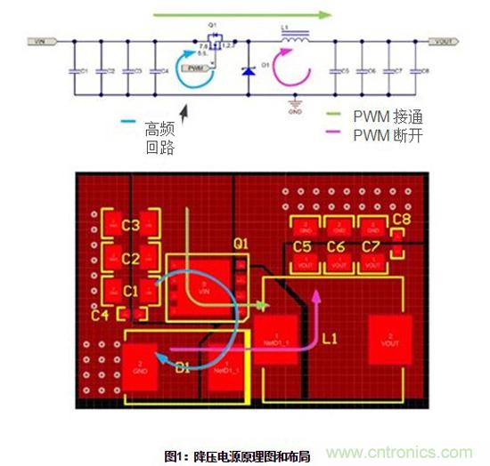 除了這些基本的布局規則,我通常首先會識別開關回路,然後確定哪些回路具有高頻開關電流。圖1所示為針對降壓電源(原理圖和布局)的簡化功率級的一個示例。
