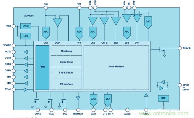 還有一種更方便的方式是選擇基於狀態機的數字電源控製器IC。例如,ADI公司的ADP1055就是這樣的器件。圖2顯示了該電路的框圖。數字邏輯係統的作用與狀態機相同。電源特性的更改可在圖形用戶界麵中進行設置,如圖1suoshi。zhexiegenggaibuhuiweiweikongzhiqichanshengxindaima,zhihuizaizhuangtaijizhongshezhibutongdejicunqizhuangtai。zhengshiyouyuzheyangdeguocheng,shuzidianyuandegongnengrengranyoushuzidianyuankongzhiqiIC的數據手冊規定,沒有任何軟件或代碼需要驗證。