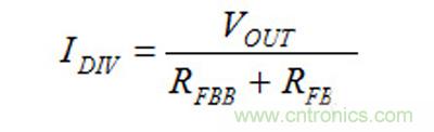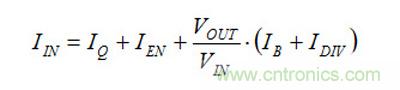 由於這個方程式沒有將轉換器中的損耗算在內,所以它給出的是一個最佳情況下的估算值。第一個被稱為IQ的數據是我在上一部分中談到的非開關式靜態電流。下一個數據項,IEN 是(shi)進(jin)入(ru)穩(wen)壓(ya)器(qi)使(shi)能(neng)輸(shu)入(ru)的(de)電(dian)流(liu)。很(hen)多(duo)轉(zhuan)換(huan)器(qi)需(xu)要(yao)一(yi)定(ding)大(da)小(xiao)的(de)偏(pian)置(zhi)電(dian)流(liu)流(liu)入(ru)使(shi)能(neng)輸(shu)入(ru)。如(ru)果(guo)使(shi)能(neng)引(yin)腳(jiao)被(bei)連(lian)接(jie)至(zhi)輸(shu)入(ru)電(dian)源(yuan),以(yi)接(jie)通(tong)穩(wen)壓(ya)器(qi)的(de)話(hua),那(na)麼(me)你(ni)必(bi)須(xu)將(jiang)這(zhe)個(ge)電(dian)流(liu)考(kao)慮(lv)在(zai)內(nei);否則的話,這個值為零。數據項IDIV 是反饋分頻器內的電流,使用方程式2,可以很容易地計算出這個值: