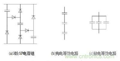 對於輸入輸出電壓相差很懸殊的情形,DC-DC變換器一般需要采用脈衝隔離變壓器來滿足電壓變比的要求。還可以采用如圖3所示的串並電容組合結構(SP)[7,8]構(gou)成(cheng)工(gong)作(zuo)儲(chu)能(neng)電(dian)容(rong)器(qi),它(ta)具(ju)有(you)串(chuan)聯(lian)充(chong)電(dian)和(he)並(bing)聯(lian)放(fang)電(dian)的(de)特(te)性(xing),因(yin)此(ci)在(zai)失(shi)去(qu)交(jiao)流(liu)電(dian)源(yuan)而(er)由(you)工(gong)作(zuo)儲(chu)能(neng)電(dian)容(rong)器(qi)放(fang)電(dian)維(wei)持(chi)工(gong)作(zuo)期(qi)間(jian),串(chuan)並(bing)電(dian)容(rong)組(zu)合(he)結(jie)構(gou)實(shi)際(ji)上(shang)起(qi)到(dao)了(le)降(jiang)壓(ya)的(de)作(zuo)用(yong)。通(tong)過(guo)選(xuan)取(qu)恰(qia)當(dang)階(jie)數(shu)的(de)串(chuan)並(bing)電(dian)容(rong)組(zu)合(he)結(jie)構(gou),就(jiu)有(you)可(ke)能(neng)在(zai)DC-DC變換器中不需要采用隔離變壓器也能滿足電壓變比的要求。