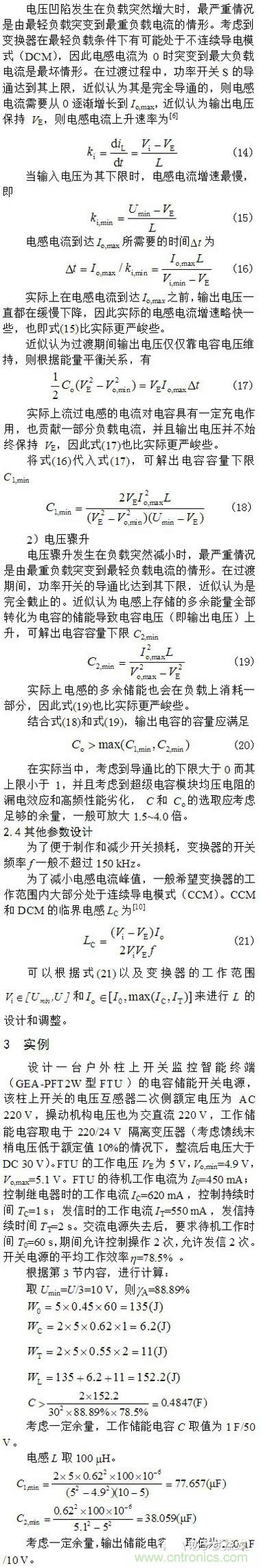 根gen據ju能neng量liang平ping衡heng關guan係xi,分fen析xi了le負fu載zai突tu然ran增zeng大da和he負fu載zai突tu然ran減jian輕qing情qing況kuang下xia的de最zui嚴yan重zhong電dian壓ya凹ao陷xian和he電dian壓ya驟zhou升sheng,並bing得de出chu輸shu出chu濾lv波bo電dian容rong容rong量liang的de設she計ji考kao慮lv。以yi一yi個ge具ju體ti的de電dian容rong儲chu能nengFTUdianyuanweili,xiangxishuomingledianlucanshudeshejifangfa,bingjinxingleshiyanyanjiu。shiyanjieguobiaomingsuoshejidedianrongchunengbeiyongdianyuannenggoumanzuzaishiquzhengchanggongdiandianyuanhouzidonghuazhongduandaiji、操作和通信的需要,並且所進行的理論分析與實際情況相符。