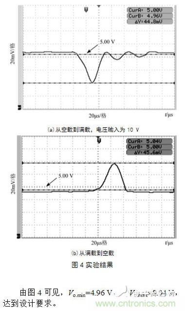 采用電阻器作為負載,並用開關分別接入和斷開進行了從空載到滿載和從滿載到空載的實驗,輸出電壓的波形如圖4所示。