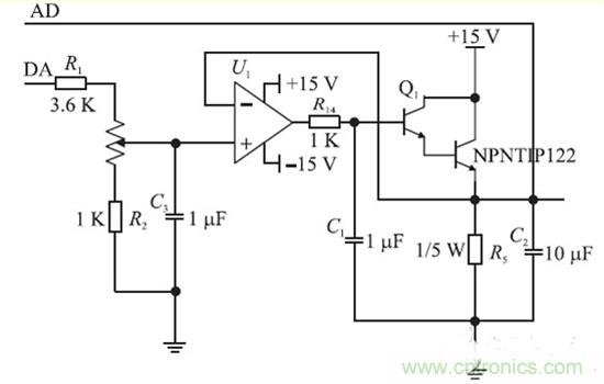 恒流源電路原理結構圖如圖2 所示,由於D/ A轉換輸出的模擬信號不穩定,加上C3 穩定電壓。經過3.6 K 的電阻和1 K 的電位器加到單運放OP07 的同相輸入端,調節電位器的阻值的大小可調節同相輸入端的電位,從而改變輸出點的電位,輸出電位加到達林頓管的B 管腳上,進入達林頓信號產生自激信號,通過C1過濾掉。利用達林頓管的電流放大特性,可實現大電流的輸出,電流放大倍數為1 000 ~15 000倍。