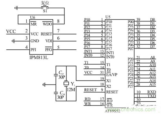 單片機最小係統圖如圖3 所示。MCU 選用ATMEL公司的AT89S52 單片機。AT89S52 是一種低功耗、高性能的CMOS 工藝的8 bit 單片機,與標準MCS51 的引腳和指令完全兼容。其外接晶振頻率範圍為0 Hz ~33 MHz,內置256 B 片內RAM,3 個16 位定時器/ 記數器,片內看門狗。其性能好於我們常用的89C52 係列單片機。