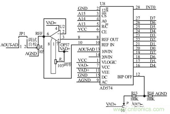 A/ D 采樣輸入電路如圖4 所示。為了滿足取樣精度需要,我們選擇12 bit A/ D 轉換器和12 bitD/ A 轉換器,使步進小於1 mA,在電路中A/ D 啟動後,先讀高8 位結果,再讀後4 bit;D/ A 是先寫入高8 bit,再寫入低4 bit.