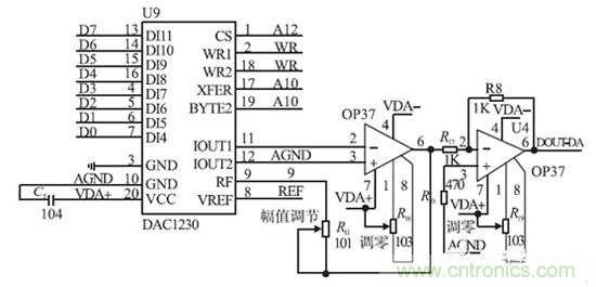 D/ A 控製輸出電路如圖5 所示。該單片機的輸入信號為經過12 bit 的A/ D 轉換器的數字量,送入單片機處理後產生輸出數字量經D/ A 轉換後送入恒流源,因而這種數控恒流源的精度最終取決與電路中A/ D 和D/ A 轉換器的轉換精度。