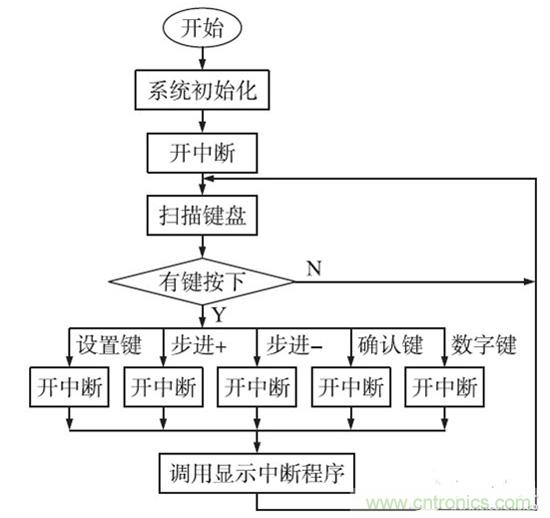 采用數字控製策略比模擬控製的有無可比擬的優勢:實現不同的控製算法;數字PID 具有設計周期短,調試和升級方便。數字控製係統主程序圖如圖6 所示。在係統加電後,主程序首先完成係統初始化,其中包括A/ D、D/ A、串行口、中斷、定時/ 計數器等工作狀態的設定,給係統變量賦初值,顯示上次設定值等。然後掃描獲取鍵值,判斷設定鍵、校準鍵是否按下,執行相應的功能子程序。當啟動鍵按下後,根據設定值、校正等參數計算對應輸出的數字量,再進行閉環反饋調整,如圖6 所示。