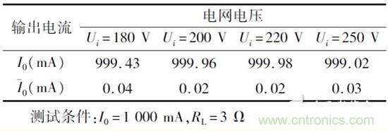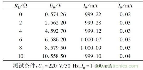 負載穩定性測試條件為U0 =220 V/50 Hz,I0 =1000 mA,測試數據如表2 所示,其中負載穩定度是指一定的工作情況下,負載變化引起的輸出電流變化。測試數據表明負載在0 ~10 贅變化時,輸出電流最大偏差為0. 99 mA,紋波電流小於0. 05 mA.