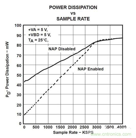 圖 1:ADS7881功耗與采樣率比較