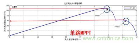 因(yin)為(wei)光(guang)伏(fu)電(dian)池(chi)陣(zhen)列(lie)是(shi)單(dan)位(wei)光(guang)伏(fu)電(dian)池(chi)組(zu)串(chuan)組(zu)成(cheng)的(de),每(mei)個(ge)組(zu)串(chuan)都(dou)有(you)自(zi)己(ji)的(de)工(gong)作(zuo)電(dian)壓(ya),電(dian)壓(ya)很(hen)大(da)概(gai)率(lv)上(shang)不(bu)一(yi)致(zhi),如(ru)果(guo)以(yi)傳(chuan)統(tong)的(de)集(ji)中(zhong)式(shi)方(fang)案(an)的(de)話(hua),組(zu)串(chuan)在(zai)彙(hui)流(liu)箱(xiang)能(neng)量(liang)彙(hui)集(ji)時(shi)並(bing)聯(lian)會(hui)發(fa)生(sheng)一(yi)次(ci)並(bing)聯(lian)失(shi)配(pei),彙(hui)流(liu)箱(xiang)到(dao)逆(ni)變(bian)器(qi)能(neng)量(liang)並(bing)聯(lian)時(shi)再(zai)發(fa)生(sheng)一(yi)次(ci)並(bing)聯(lian)失(shi)配(pei),嚴(yan)重(zhong)影(ying)響(xiang)光(guang)伏(fu)電(dian)池(chi)組(zu)件(jian)的(de)發(fa)電(dian)效(xiao)率(lv)。如(ru)下(xia)圖(tu)3所示,單路MPPTdeqingkuangxia,guangfudianchizujianshoudaogezhongyinsudeyingxiang,huidaozhichuxianlianggehuoduogebofengdeqingkuang,genzongdaorenheyigebofengdouhuiduifadianliangzaochengsunshi。erruguoduoluMPPT的情況下,能精確跟蹤到每一個組串的特性,形成多條MPPT曲線,使得每串光伏電池組串最大效能的發揮作用。