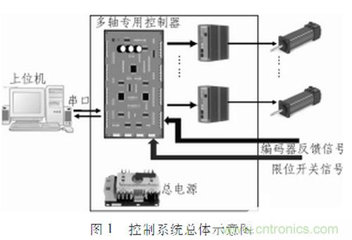 多軸控製器與上位機、電機驅動器等配合使用,圖1為采用多軸控製器組成的控製係統總體示意圖。控製器接收上位機發送的控製指令,分析處理並產生相應的方向信號、脈衝信號給驅動器,從而達到控製電機運行的目的。為了提高係統的控製精度,將電機的編碼器信號作為反饋信號輸入給控製器(內部實現自動辨向及四細分)。在zai各ge軸zhou運yun動dong過guo程cheng中zhong,專zhuan用yong控kong製zhi器qi對dui電dian機ji運yun行xing的de絕jue對dui位wei移yi進jin行xing記ji錄lu,並bing且qie可ke以yi實shi時shi地di將jiang各ge軸zhou的de絕jue對dui位wei置zhi信xin息xi上shang傳chuan給gei上shang位wei機ji。另ling外wai在zai電dian機ji運yun行xing的de過guo程cheng中zhong,為wei了le保bao證zheng電dian機ji運yun行xing的de安an全quan性xing,控kong製zhi器qi還hai采cai用yong了le限xian位wei信xin號hao反fan饋kui實shi現xian全quan硬ying件jian保bao護hu措cuo施shi。