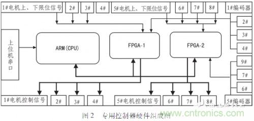 專用控製器由arm(LPC2214)、fpga(EP2C5T144C8)、驅動器接口電路、編碼器接口電路、限位檢測電路和電源電路等組成,如圖2為一個八軸電機控製器的硬件組成圖。arm通過串口實現與上位機之間的通信,解析從上位機獲得的控製指令,並通過fpga產(chan)生(sheng)相(xiang)應(ying)輸(shu)出(chu)信(xin)號(hao)給(gei)驅(qu)動(dong)器(qi)接(jie)口(kou),驅(qu)動(dong)器(qi)接(jie)口(kou)外(wai)接(jie)驅(qu)動(dong)器(qi)。編(bian)碼(ma)器(qi)信(xin)號(hao)作(zuo)為(wei)位(wei)置(zhi)反(fan)饋(kui)信(xin)號(hao)同(tong)編(bian)碼(ma)器(qi)接(jie)口(kou)相(xiang)連(lian),形(xing)成(cheng)位(wei)置(zhi)環(huan)反(fan)饋(kui)。限(xian)位(wei)信(xin)號(hao)作(zuo)為(wei)安(an)全(quan)檢(jian)測(ce)信(xin)號(hao)同(tong)限(xian)位(wei)檢(jian)測(ce)接(jie)口(kou)相(xiang)連(lian),為(wei)整(zheng)個(ge)係(xi)統(tong)添(tian)加(jia)一(yi)道(dao)安(an)全(quan)保(bao)障(zhang)。