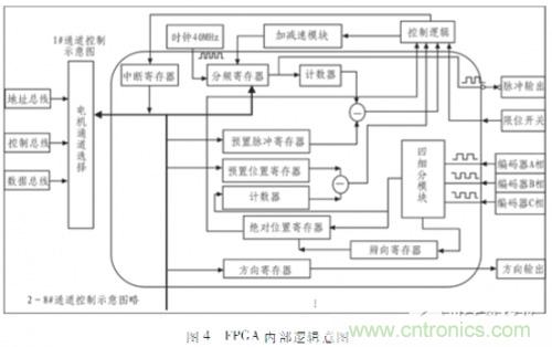 專用控製器在完成整個控製的過程中,arm隻負責指令解析、控製指令發送、實時數據上傳等任務,fpga才是多軸專用控製器的核心。通過Verilog HDL語言在fpga內部實現了加減速曲線、編碼器信號辯向及四細分、絕對位移記錄等功能。圖3為電機控製的整體輸入、輸出信號圖,通過片選信號CS、讀有效信號rd_enable、寫有效圖信號wr_enable進行電機通道選擇。圖4給出了1#通道控製的fpga內部邏輯示意圖,下麵將逐一對各主要模塊進行詳細介紹。