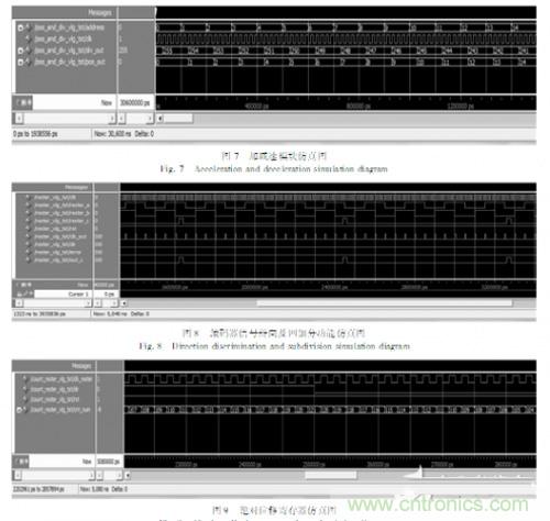 在QuartusⅡ編譯環境下成功編譯之後,調用Modulesim仿真軟件,編寫仿真程序,使之產生全局時鍾、複位信號、相位差為90度的A、B相信號和Z相信號。如圖8所示,給出了該多軸控製器中所采用的編碼器信號辯相及四細分的功能仿真圖。