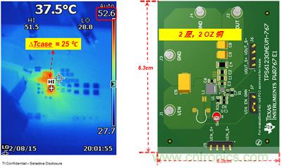 TPS61230A基於穀值限流模式控製方案,最小開關電流為4.8A。該器件集成了兩個低RDS(on)FET(18mΩ/高速,21mΩ/低速),這使其具有更高的效率和更良好的熱性能。在室溫條件下,VIN = 3.6V,VOUT = 5.0V,IOUT = 2.0A時,隻能實現25℃的升溫,如圖3所示。