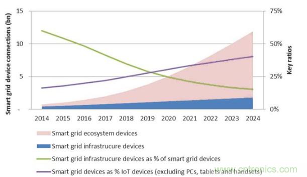 這些數字有三個明確的信息。首先,物聯網智能電網中包括的設備總量預計將迅速增長,從今天的不到10億而2024年增加將達到120億yi。第di二er,也ye許xu不bu奇qi怪guai的de是shi,在zai依yi賴lai於yu智zhi能neng電dian網wang功gong能neng的de設she備bei之zhi前qian,將jiang采cai用yong與yu智zhi能neng電dian網wang基ji礎chu設she施shi相xiang關guan的de設she備bei。第di三san,與yu智zhi能neng電dian網wang相xiang關guan的de設she備bei將jiang占zhan據ju連lian接jie設she備bei的de越yue來lai越yue多duo的de份fen額e。這zhe些xie預yu測ce顯xian示shi,到dao2024年,預計所有物聯網設備雲連接(不包括PC,平板電腦和手機)的40%以上屬於智能電網生態係統,將智能電網和VPP概念牢固地置於物聯網(IoT)的核心之中。