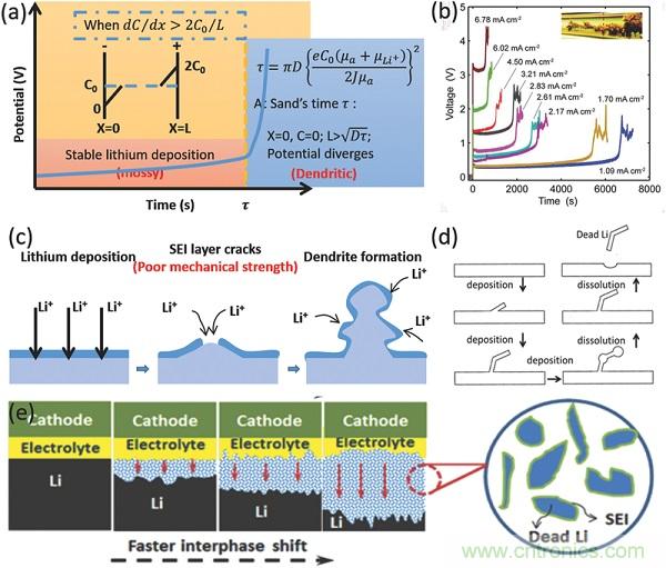 LMBs中鋰離子的行為與LIBs中鋰離子的插入/脫嵌行為完全不同。通常,在充電期間,鋰離子從外部電路獲得電子,然後以金屬-鋰顆粒的形式直接沉積在負極表麵或下方。如果不對體係進行任何修飾,就會在鋰負極的頂部形成枝晶狀圖案。為了揭示鋰沉積行為、負極形態和界麵的演變,各研究小組通過計算或高級表征技術從不同方麵提出了相關模型。