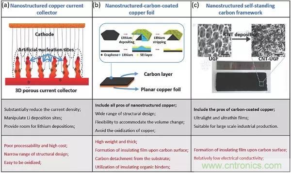 鋰li粉fen末mo和he表biao麵mian改gai性xing的de鋰li箔bo可ke以yi作zuo為wei平ping麵mian鋰li箔bo的de替ti代dai物wu,以yi延yan遲chi枝zhi晶jing的de產chan生sheng。負fu極ji的de表biao麵mian積ji大da大da增zeng加jia以yi提ti供gong相xiang當dang大da的de沉chen積ji位wei置zhi,從cong而er在zai一yi段duan時shi間jian內nei抑yi製zhi枝zhi晶jing生sheng長chang。然ran而er,鋰li箔bo的de表biao麵mian狀zhuang態tai和he粉fen末mo之zhi間jian的de邊bian界jie不bu會hui持chi續xu很hen長chang時shi間jian,並bing且qie整zheng個ge箔bo在zai長chang時shi間jian循xun環huan中zhong會hui變bian成cheng隨sui機ji分fen散san的de鋰li微wei結jie構gou的de聚ju集ji體ti。相xiang比bi之zhi下xia,集ji流liu體ti(CCs)方fang法fa取qu得de了le較jiao好hao的de表biao現xian,傳chuan統tong銅tong箔bo被bei納na米mi結jie構gou化hua的de材cai料liao代dai替ti。之zhi後hou為wei了le避bi免mian納na米mi結jie構gou銅tong的de缺que點dian,開kai發fa了le碳tan塗tu覆fu的de銅tong箔bo,這zhe些xie碳tan塗tu層ceng都dou貢gong獻xian了le更geng好hao的de電dian化hua學xue性xing能neng,這zhe與yu其qi優you異yi的de導dao電dian性xing、高比表麵積和合適的孔徑/體積比具有密切的關係。與納米結構或碳塗層銅箔相比,自支撐碳膜本身可直接作為CCs,能夠避免有機粘合劑或碳脫落產生的導電性所帶來的不利影響。