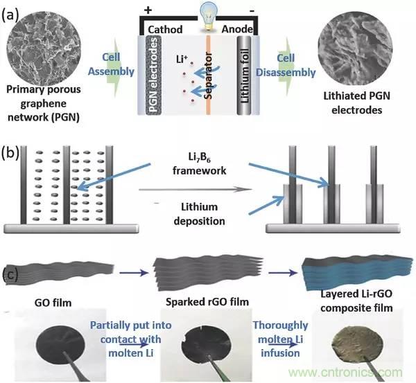 由於不存在鋰源,上述三種類型的CCs(即納米結構銅、碳塗覆銅、自支撐碳框架)不能直接用於LMBs中。在LMBs中需要額外的將鋰電沉積到這些CCs中並進行後續的電池拆卸過程。除了複雜性之外,這種組裝/拆卸過程可能引入雜質,引起副反應,並破壞負極的完整性。所以研究者又製造了含鋰合金,如Li-Mg、Li-B、Li-Sn等,並且在LMBs中(zhong)使(shi)用(yong)時(shi)無(wu)枝(zhi)晶(jing)形(xing)態(tai)。然(ran)而(er),高(gao)品(pin)質(zhi)鋰(li)合(he)金(jin)難(nan)以(yi)製(zhi)備(bei),特(te)別(bie)是(shi)具(ju)有(you)特(te)定(ding)納(na)米(mi)結(jie)構(gou)的(de)鋰(li)合(he)金(jin)。最(zui)近(jin)開(kai)發(fa)了(le)熔(rong)融(rong)鋰(li)浸(jin)液(ye)作(zuo)為(wei)負(fu)載(zai)鋰(li)的(de)新(xin)技(ji)術(shu)。這(zhe)種(zhong)方(fang)法(fa)將(jiang)傳(chuan)統(tong)的(de)加(jia)載(zai)過(guo)程(cheng)從(cong)內(nei)部(bu)轉(zhuan)移(yi)到(dao)外(wai)部(bu),在(zai)可(ke)控(kong)性(xing)、加載質量和CCs的選擇上更有優勢。