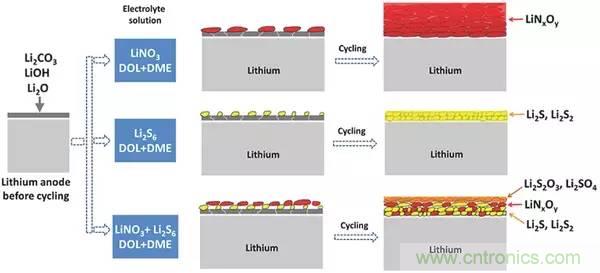 圖7.具有相同LiTFSI-DOL成分的不同電解質中鋰負極循環的表麵膜行為