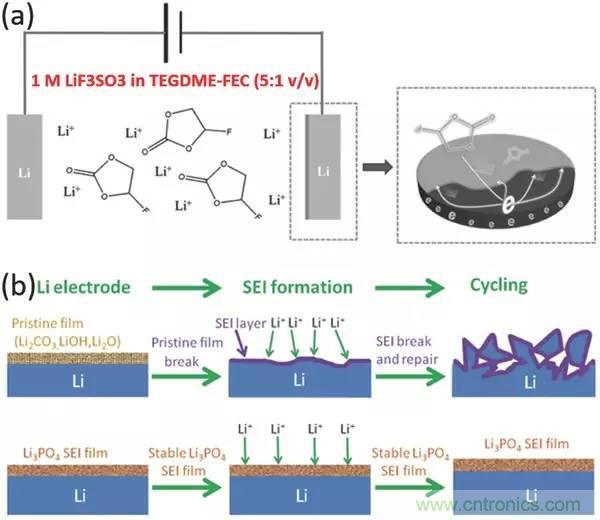通常,本征SEI層由各種有機物(低聚物和聚合物)和無機物組成,其中有機部分賦予SEI層柔性以適應鋰沉積,而無機部分能夠實現快速的鋰離子傳輸。然而,無機碳酸鋰(Li2CO3)和鋰乙烯碳酸氫鈉(LEDC)作為兩個主要的SEI組分,在鋰沉積電位附近是熱力學不穩定的,並且允許循環中反應發生,而氧化鋰(Li2O)是唯一的熱力學和動力學穩定的組分,最裏麵的SEI層中的Li2O薄層是非常重要的,以避免在沒有氟化物源的情況下破裂。此外,化學和物理各向異性在SEI層ceng內nei是shi常chang見jian的de,同tong時shi導dao致zhi異yi質zhi鋰li通tong量liang和he不bu均jun勻yun沉chen積ji。沉chen積ji和he溶rong解jie時shi,由you無wu機ji離li子zi香xiang料liao組zu成cheng的de表biao麵mian不bu能neng適shi應ying形xing態tai變bian化hua,因yin此ci可ke能neng會hui分fen解jie,導dao致zhi高gao度du不bu均jun勻yun的de鋰li沉chen積ji,使shi得de枝zhi晶jing形xing成cheng。迄qi今jin為wei止zhi,選xuan擇ze合he適shi的de溶rong劑ji、鋰鹽和添加劑可以有效和高效地調節SEI層的性質。