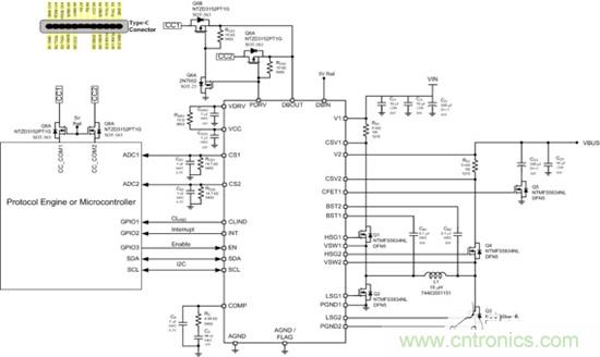 因此,要想滿足USB type-c和Quick Charge這兩個標準,就需要一款能夠根據用電設備的要求進行電壓調節的電源控製器。單電感H橋升降壓電源控製器 NCP81239就是非常理想的選擇。它可以適配寬輸入電壓範圍和寬輸出電壓範圍,芯片集成的I2C接口可和外部的微控製器(MCU)配合進行輸出電壓的步進調整,且可在同一個type-c端口實現多種快充協議,還能對接蘋果LighTIng 接口快充協議、三星接口快充協議等等。