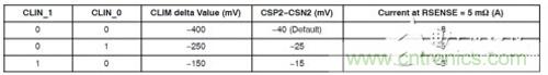 對4開關同步整流的升降壓控製在輕載模式、重載到輕載的轉換過程、輸出過壓保護、輸出從高電壓向低電壓調整過程中會有反向電流產生。CSP2/CSN2用於反向電流的檢測,當反向電流超過限流設定值時,如果輸出電壓在設定電壓範圍內,Q4會立即關斷防止反方向電流繼續增加。如果是在在降壓模式下,Q2關斷時Q4會重新導通。過流保護值可以通過I2C或電流檢測電阻進行設定,電流檢測電阻的選擇要保證CSP2-CSN2的電壓在過流時也不要超過100mV的運放差模電壓範圍。如果采用5毫歐檢測電阻,對應的峰值過流保護值如下表,默認值-8 A。