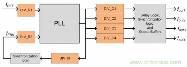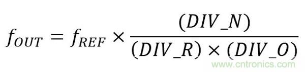 圖 1 為高性能時鍾設備的基本 PLL 架構。該設計使用比例因子為 PLL 輸出端口提供時鍾合成。最終輸出頻率的基本公式為: