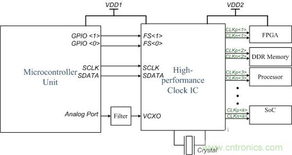 時鍾 IC 屬於 I2C 從器件,需要主控製器來配置內部 PLL 邏輯,其控製邏輯可以寫入微控製器內。作為 I2C 主機,微控製器將配置寫入時鍾 IC 的內部易失性存儲器並控製 PLL。因此,可以通過板上 MCU - IC 組合進行係統時鍾頻率的動態更新。可編程微控製器為高性能時鍾 IC 提供控製邏輯能力,通過減少板載 IC和板上走線使整體設計更加緊湊,並降低最終物料成本。
