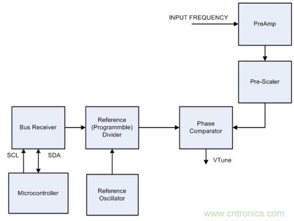微控製器通過 I2C 發送數據到可編程分頻器。該分頻器也接收來自參考振蕩器(例如 4 MHz 晶體振蕩器)的輸入。相位比較器(即相位檢測器)通過預分頻器接收本地振蕩器頻率(例如 87.15 MHz),還通過參考分頻器和參考振蕩器接收微控製器的輸入(例如,87.15 MHz)。如果兩個輸入都匹配,相位比較器將提供 Vtune 調諧電壓。一旦本地振蕩器頻率與微控製器頻率數據之間稍有不匹配,都將無法提供調諧電壓 (Vtune) 和輸出。圖 3 所示為完整的框圖。