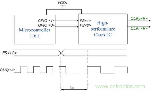 高性能時鍾設備支持包含個性化配置的多個用戶配置文件。在 FS 引腳轉換方麵,高性能時鍾器件具有兩個時序規格 - 快速切換和慢速切換。