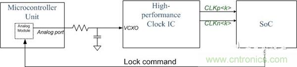 對某些應用而言,輸出時鍾頻率應通過使用模擬反饋跟蹤輸入數據流。如圖 5 所示,時鍾 IC 作為大鎖相環的一部分。ASIC 或 SoC 負責跟蹤輸入流、計算誤差並產生 PWM 信號(通常來說),隨後將誤差信息反饋至本地時鍾發生器以進行頻率調諧。