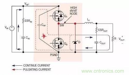 圖4顯示的是升壓轉換器中的連續電流回路與脈衝電流回路。此時,應在靠近MOSFET QB與升壓二極管D的輸出端放置高頻陶瓷電容CHF.