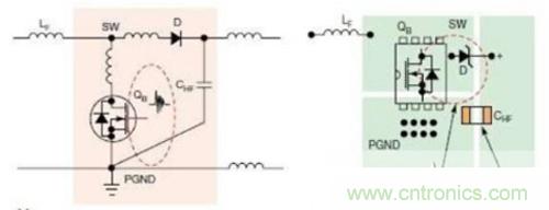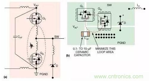 圖5.本圖顯示的是升壓轉換器中的熱回路與寄生PCB電感(a);為減少熱回路麵積而建議采用的布局(b)。