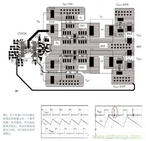圖6和圖7(略)提供了一個同步降壓電路的例子,它強調了去耦電容的重要性。圖6a是一個雙相12VIN、2.5VOUT/30A(最大值)的同步降壓電源,使用了LTC3729雙相單VOUT控製器IC.在無負載時,開關結點SW1和SW2的波形以及輸出電感電流都是穩定的(圖6b)。但如果負載電流超過13A,SW1結點的波形就開始丟失周期。負載電流更高時,問題會更惡化(圖6c)。