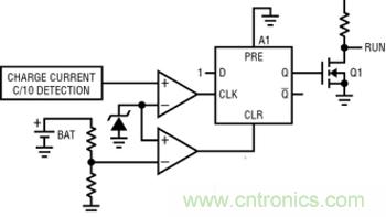 前述電路的方框圖如圖 1 所示。該電路基於一個 D 觸發器。隨著充電電流值降至預設定的 C/10,D 觸發器時鍾變為高電平,外部晶體管 Q1 將 RUN 引腳拉至地,並關斷 LTC4012。電池充電,電壓接近最大值。隨著充電器關斷,電池開始放電,最終達到最小電壓,D 觸發器清零,然後 Q1 關斷,充電周期重複。