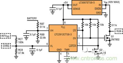 如果電池充電,那麼 LTC2912-3 的 VH 輸入上的電壓高於 0.5V,/UV 輸出為高電平。Q2 接通,/LATCH 引腳為低,輸出 OV 閉鎖在高電平狀態。相應地,Q1 接通,LTC4012 處於關斷模式。隻要 /LATCH 引腳為低,OV 閉鎖在高電平狀態,LTC4012 就繼續保持關斷狀態。