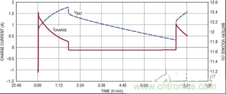 為了驗證電路功能,將一個數據記錄器連至充電器-電池係統。對電池電壓和電流進行采樣和存儲。為了方便電池的自放電並縮短放電時間,在電池端子之間連接一個 100Ω 電阻器。所產生的圖形如圖 3 所示。在周期一開始時,輸入電壓 VIN 被斷開,電池放電,並向負載提供“負”電流。然後,加上 VIN 後,充電周期啟動,“正”的充電電流流進電池。當電池充滿電以後,充電器關斷,電池開始自放電。當電池電壓達到最小值時,充電器接通,周期自我重複。