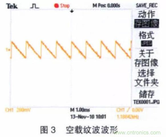 圖3 所示為空載時MAX606 輸出電壓紋波波形(Uo≈12 V),即開關紋波,其頻率為1.18 kHz,波形穩定,Vpp=240 mV。圖4 所示為負載120 Ω 時輸出電壓的紋波波形,從圖4 中可以看出加入負載後電源紋波變得比較複雜,其最高Vpp達到1.2 V。為係統供電時,該紋波將會對係統造成嚴重危害,必須對此紋波進行抑製。