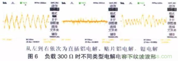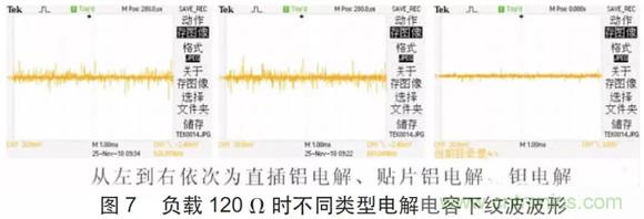 圖6 所示為負載是300 Ω 時(shi)不(bu)同(tong)類(lei)型(xing)電(dian)解(jie)電(dian)容(rong)下(xia)所(suo)測(ce)量(liang)到(dao)的(de)紋(wen)波(bo)波(bo)形(xing),可(ke)以(yi)明(ming)顯(xian)看(kan)出(chu)使(shi)用(yong)貼(tie)片(pian)鋁(lv)電(dian)解(jie)紋(wen)波(bo)最(zui)小(xiao),使(shi)用(yong)普(pu)通(tong)鋁(lv)電(dian)解(jie)紋(wen)波(bo)較(jiao)大(da)且(qie)紋(wen)波(bo)具(ju)有(you)毛(mao)刺(ci),使(shi)用(yong)貼(tie)片(pian)鉭(tan)電(dian)解(jie)紋(wen)波(bo)有(you)所(suo)減(jian)小(xiao)且(qie)毛(mao)刺(ci)也(ye)有(you)很(hen)大(da)程(cheng)度(du)的(de)改(gai)善(shan)。