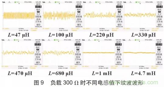 圖9 所示為負載為300 Ω 時不同電感值下紋波波形圖,從圖9 中可以看出,隨電感值增大,紋波被抑製程度越大,輸出紋波越小。當電感值增大到1 mH 時,紋波效果最好,且輸出基本上沒有毛刺。