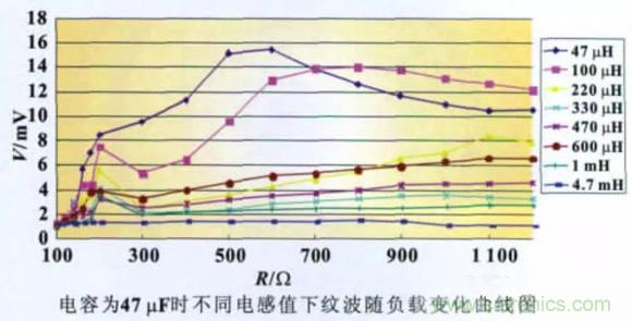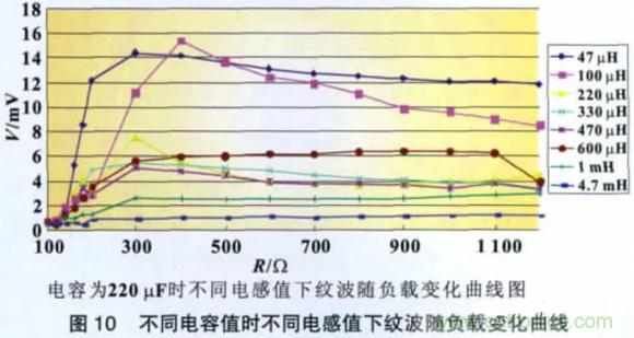 圖10 所示為在不同電容值(貼片鉭電解)下,改變電感和負載並測量負載上的電源紋波有效值所得出的曲線圖。